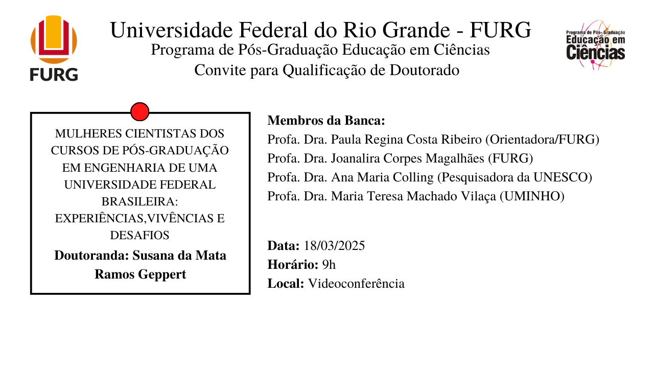 Vimos através deste, convidar para a Qualificação de Doutorado da discente Susana da Mata Ramos Geppert que ocorrerá no dia 18/03/2025 às 9h.