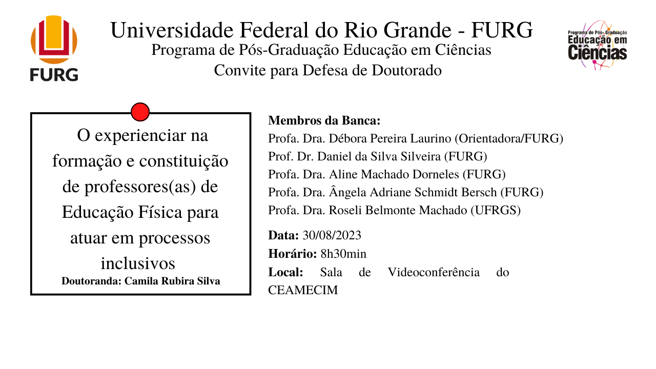 Vimos através deste, convidar para a Defesa de Doutorado da discente Camila Rubira Silva que ocorrerá no dia 30/08/2023 às 8h30min.