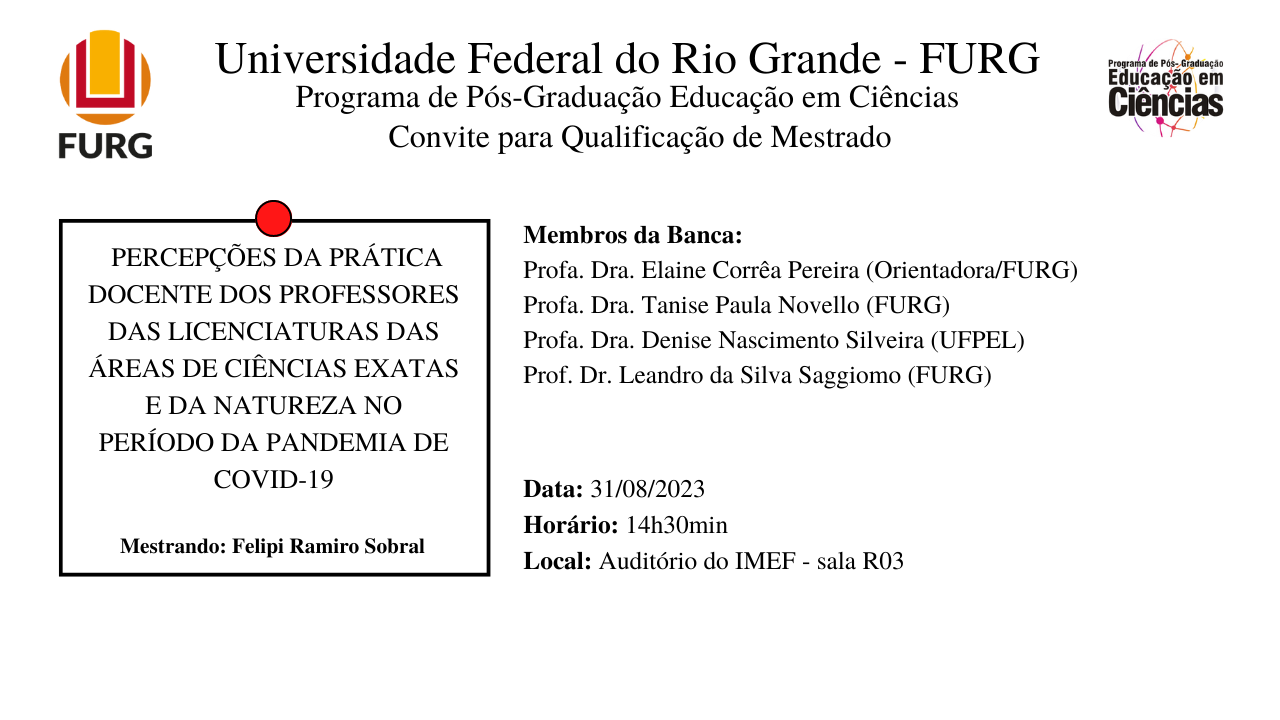 O projeto de dissertação intitula-se: "PERCEPÇÕES DA PRÁTICA DOCENTE DOS PROFESSORES DAS LICENCIATURAS DAS ÁREAS DE CIÊNCIAS EXATAS E DA NATUREZA NO PERÍODO DA PANDEMIA DE COVID-19"