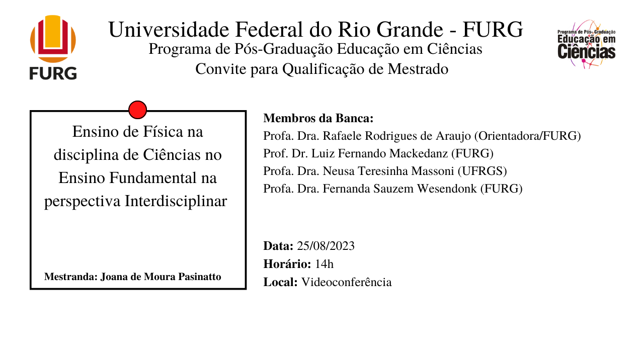 Vimos através deste, convidar para a Qualificação de Mestrado da discente Joana de Moura Pasinatto que ocorrerá no dia 25/08/2023 às 14h.