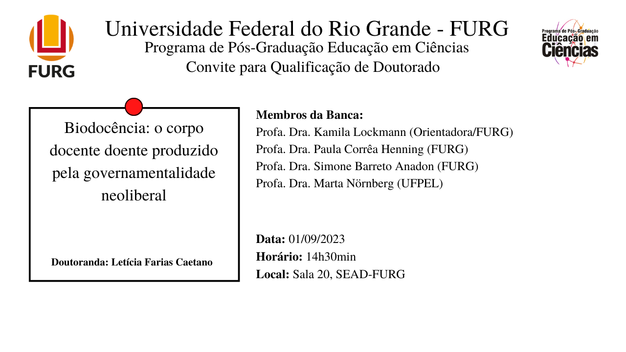 Vimos através deste, convidar para a Qualificação de Doutorado da discente Letícia Farias Caetano que ocorrerá no dia 01/09/2023 às 14h30min.