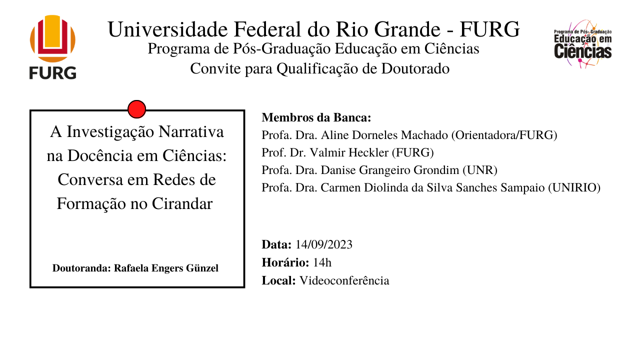 Vimos através deste, convidar para a Qualificação de Doutorado da discente Rafaela Engers Günzel que ocorrerá no dia 14/09/2023 às 14h.