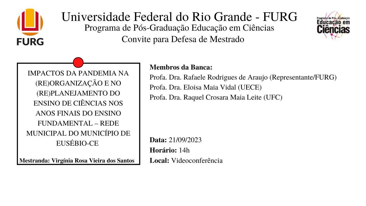 A dissertação intitula-se: " IMPACTOS DA PANDEMIA NA (RE)ORGANIZAÇÃO E NO (RE)PLANEJAMENTO DO ENSINO DE CIÊNCIAS NOS ANOS FINAIS DO ENSINO FUNDAMENTAL – REDE MUNICIPAL DO MUNICÍPIO DE EUSÉBIO-CE"
