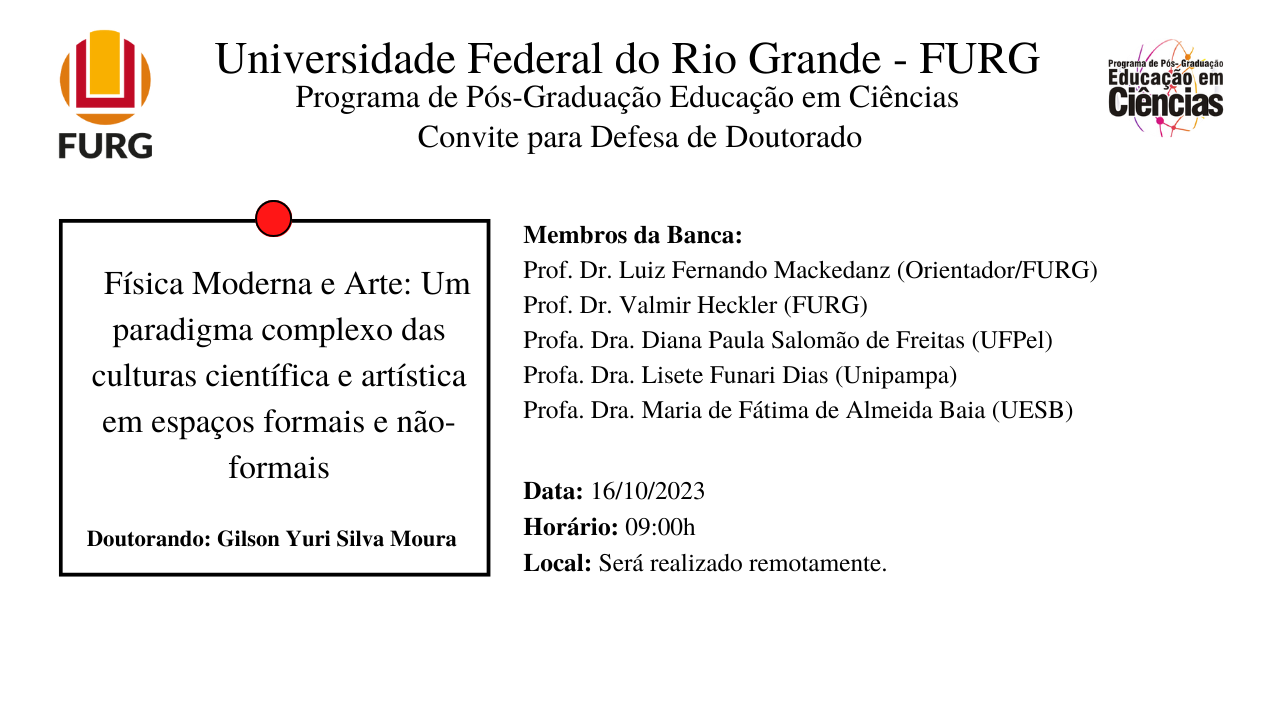 Vimos através deste, convidar para a Defesa de Doutorado do discente Gilson Yuri Silva Moura que ocorrerá no dia 16 /10/2023 às 09:00h.