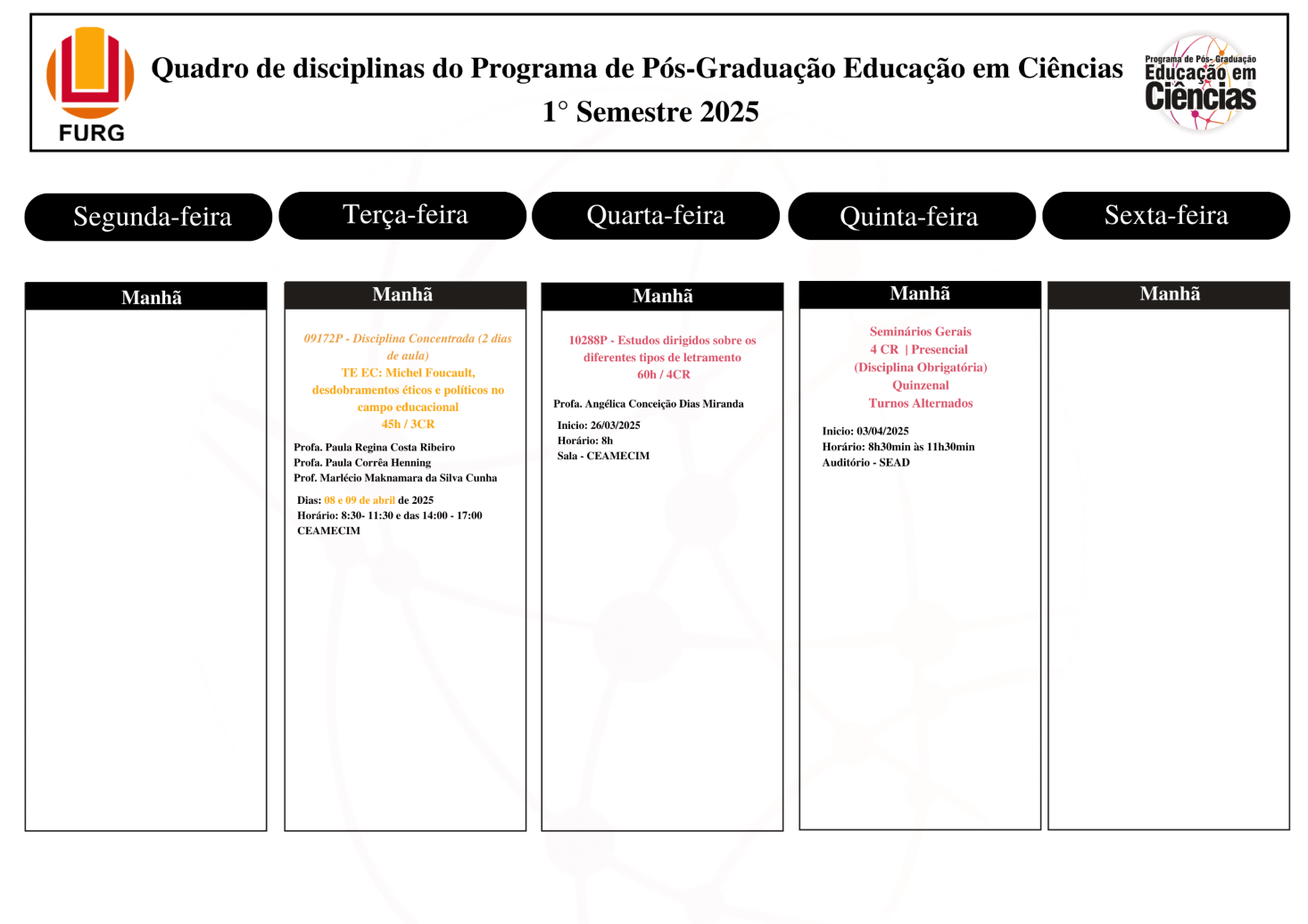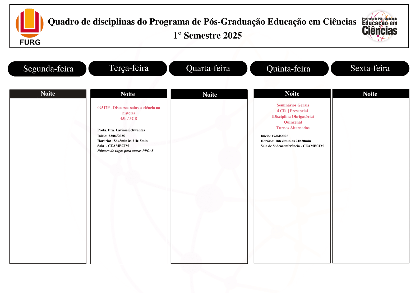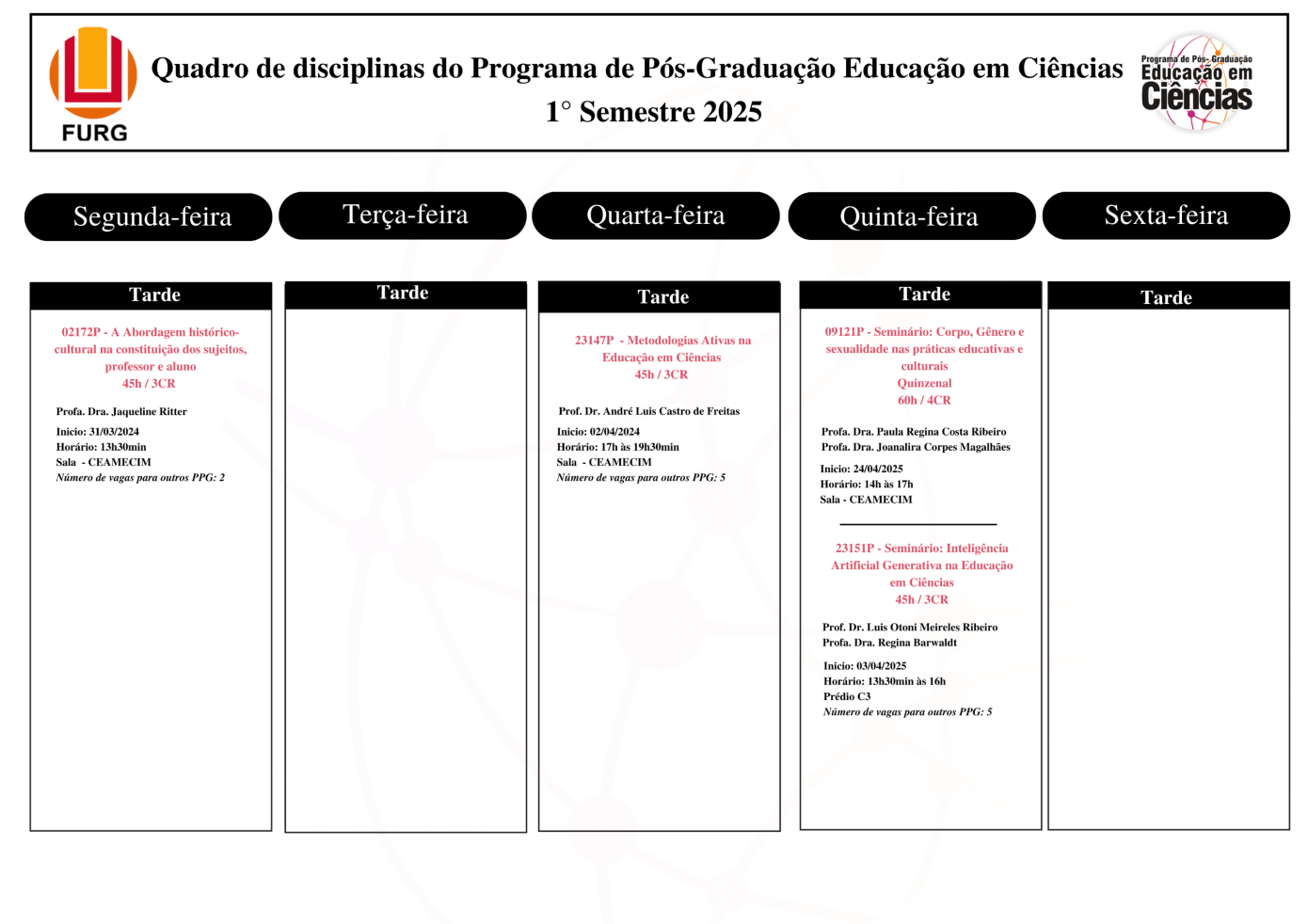 O PPG Educação em Ciências informa que o período de matrículas para o semestre 1/2025 será de 22/02 à 12/03, através da aba "solicitações", no sistema FURG. Confira o Quadro de Oferta e solicita a(s) disciplina(s) desejada(s).