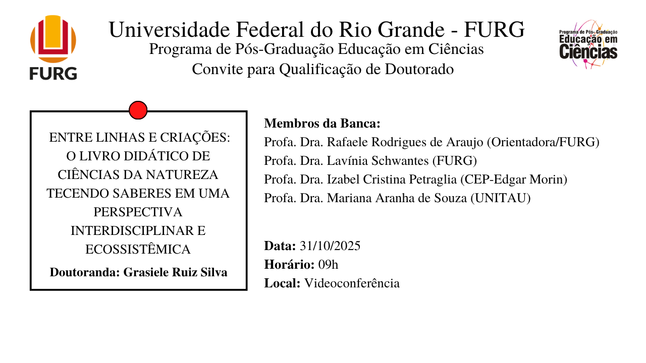 Vimos através deste, convidar para a Qualificação de Doutorado da discente Grasiele Ruiz Silva que ocorrerá no dia 31/10/2025 às 09h.