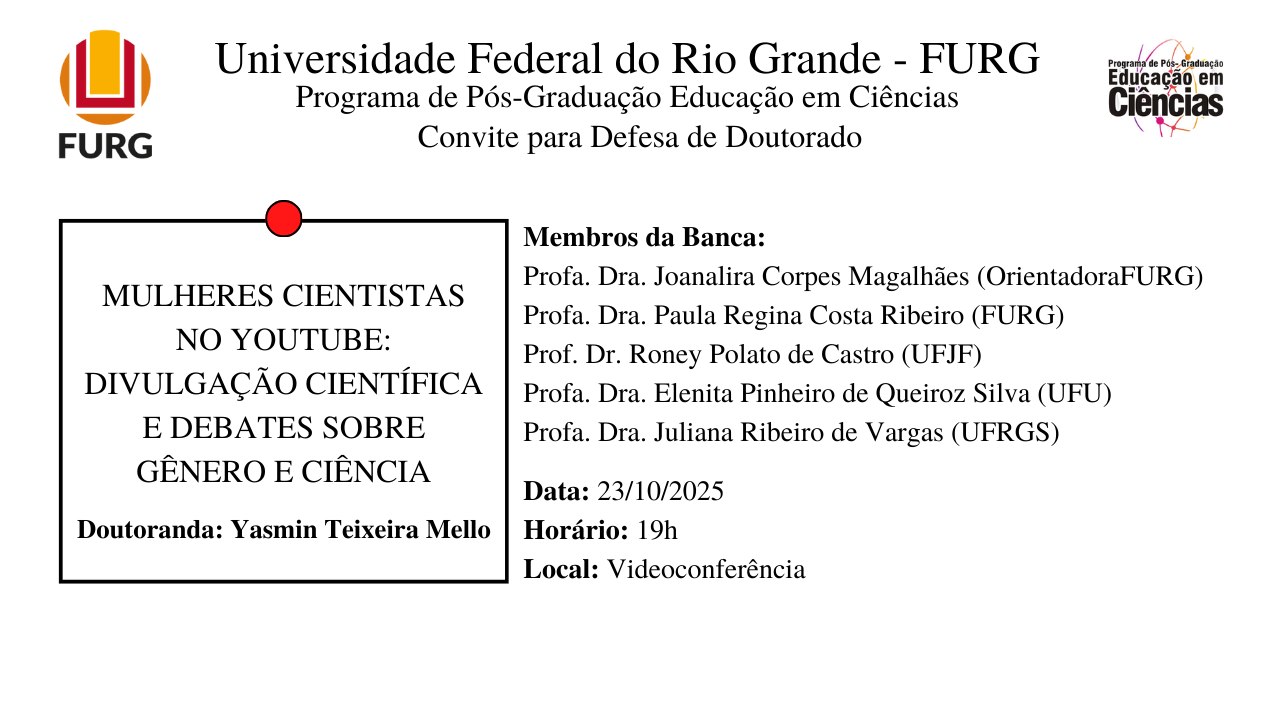 Vimos através deste, convidar para a Defesa de Doutorado da discente Yasmin Teixeira Mello que ocorrerá no dia 23/10/2025 às 19h.