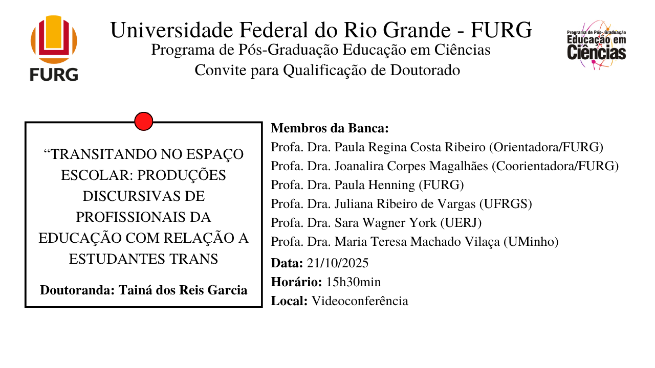 Vimos através deste, convidar para a Qualificação de Doutorado da discente Tainá dos Reis Garcia que ocorrerá no dia 21/10/2025 às 15h30min.