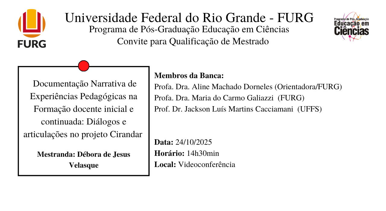 Vimos através deste, convidar para a Qualificação de Mestrado da discente Débora de Jesus Velasque que ocorrerá no dia 24/10/2025 às 14h30min.