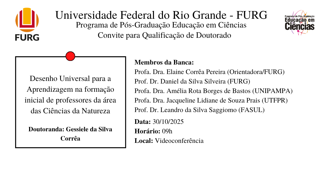 Vimos através deste, convidar para a Qualificação de Doutorado da discente Gessiele da Silva Corrêa que ocorrerá no dia 30/10/2025 às 09h.