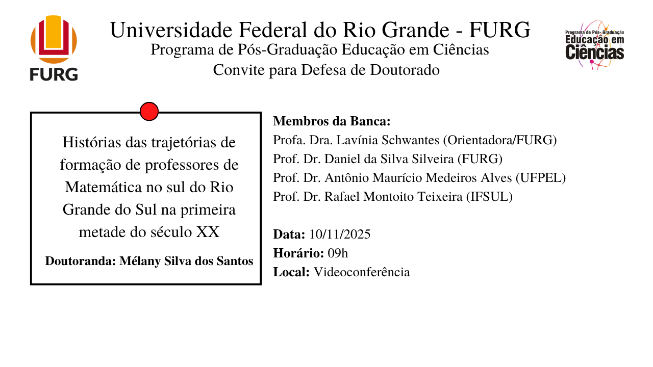 A tese intitula-se: "Histórias das trajetórias de formação de professores de Matemática no sul do Rio Grande do Sul na primeira metade do século XX ".