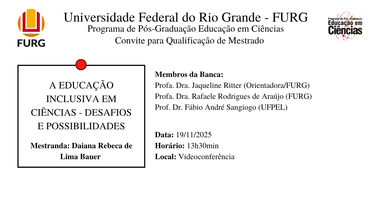 Vimos através deste, convidar para a Qualificação de Mestrado da discente Daiana Rebeca de Lima Bauer que ocorrerá no dia 19/11/2025 às 13h30min.